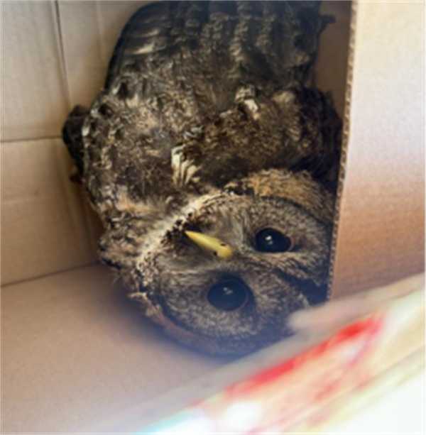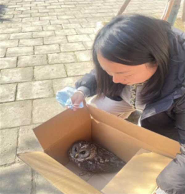 为避免二次伤害,周荣华立即联系野生动物救助站,并小心翼翼地将灰林鸮移至透气安静的纸箱中,带回做进一步检查。经检查,这只灰林鸮体长约30厘米,属于亚成体,除翅膀表皮擦伤外,并无骨折或内伤,主要表现为受惊后的应激反应。
