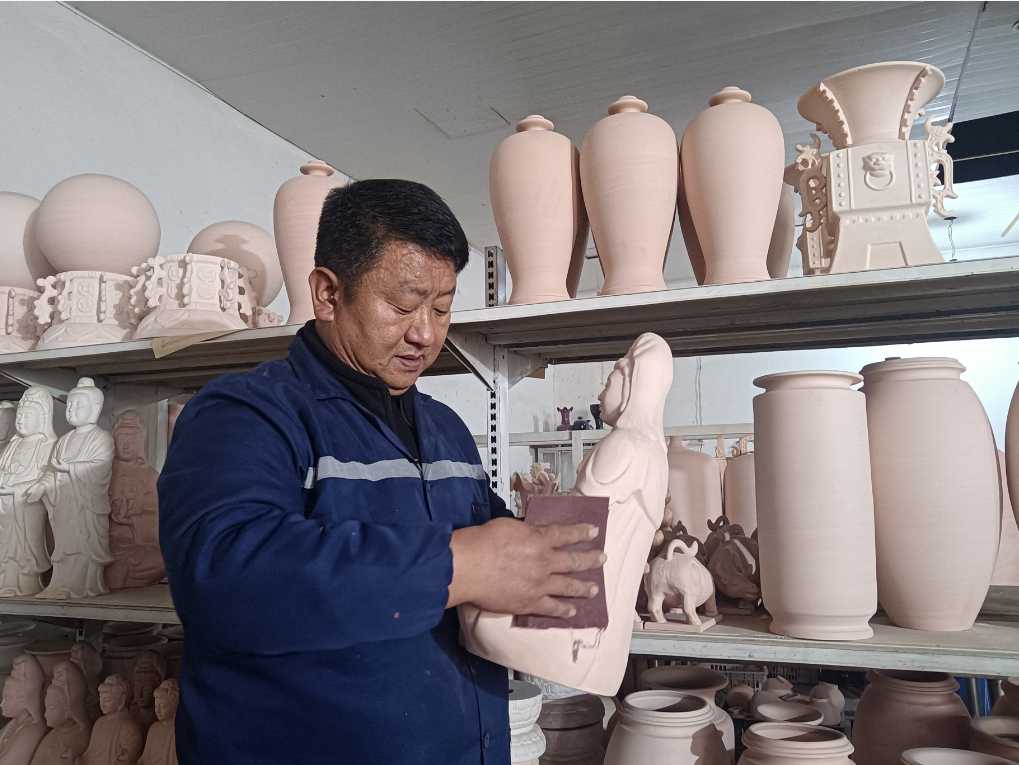 他的努力,换来了累累硕果。如今,他的产品不仅销往北京、上海等国内各大城市,并且还走出国门,远销韩国、日本等国家。他创作的“三羊开泰”“腰鼓”等作品,在各类艺术展览中屡获殊荣。2023年,他荣获“河南省陶瓷工艺大师”称号,这份荣誉,是对他三十余年坚守的最好褒奖。