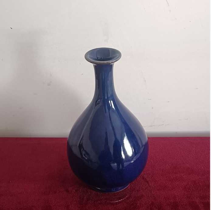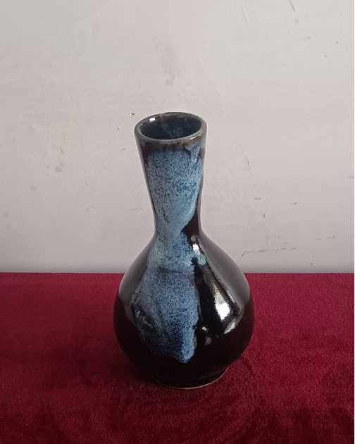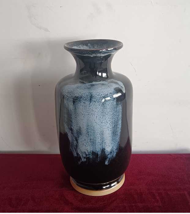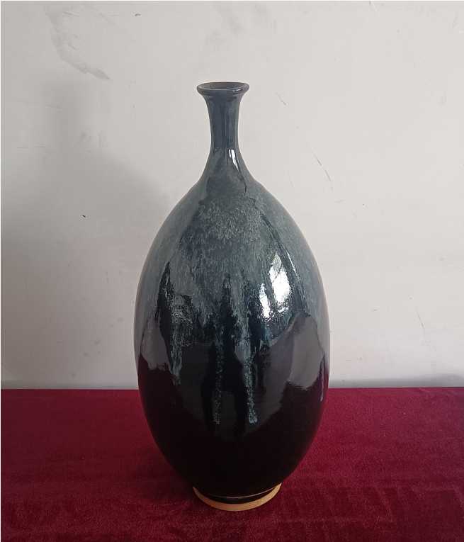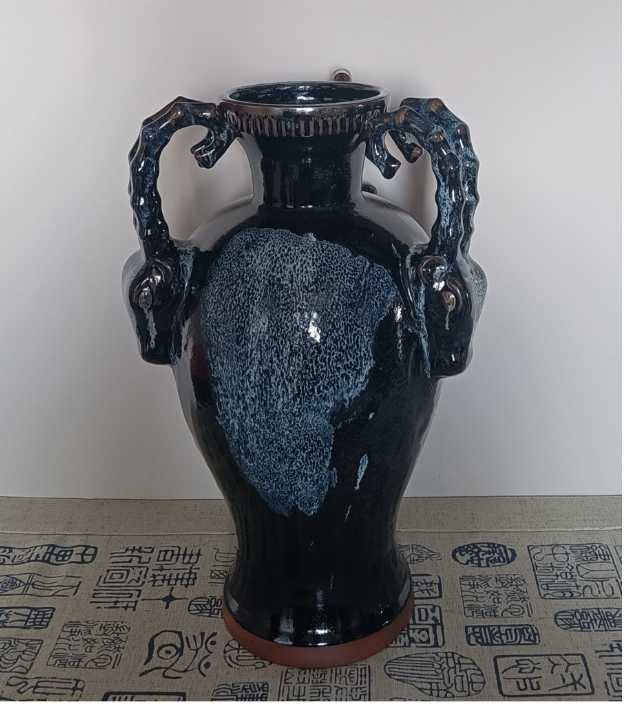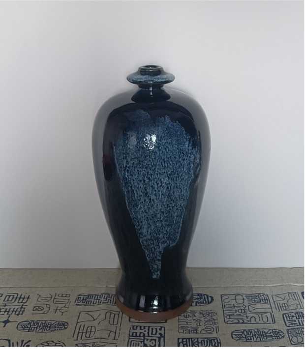 施釉,则是鲁山花瓷独具魅力的一步。李新春沿用祖传的泼釉技法,釉浆从高空倾泻而下,如瀑布飞漱,似流云漫卷。黑釉如深邃的长夜,蓝白釉色如划破长夜的星光,在坯体上自然交融、流淌,形成独一无二的纹路。“每一次泼釉,都是一次与自然的合作。釉色的走向,纹路的形成,全凭天时地利与心境,没有两件完全相同的鲁山花瓷。”李新春的话语里,满是对这份“天成”的敬畏。