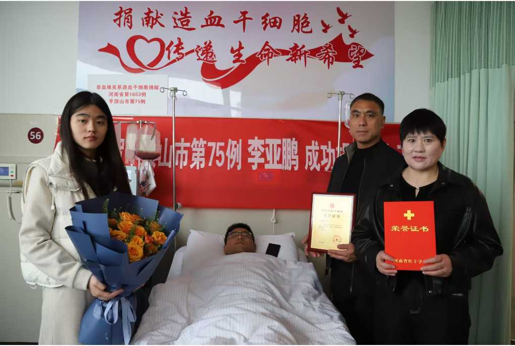 上午10时许,市红十字会专职副会长李元玉、郏县红十字会副会长李攀阁来到现场,为他献上鲜花,并颁发荣誉证书。证书显示,李亚鹏是河南省第1614例非血缘关系造血干细胞捐献者,也是平顶山市第75例捐献者。李亚鹏所在单位郏县长桥镇的领导和同事也专程赶来探望。市、县红十字会志愿者纷纷到场,为他加油鼓劲儿。