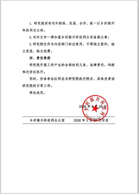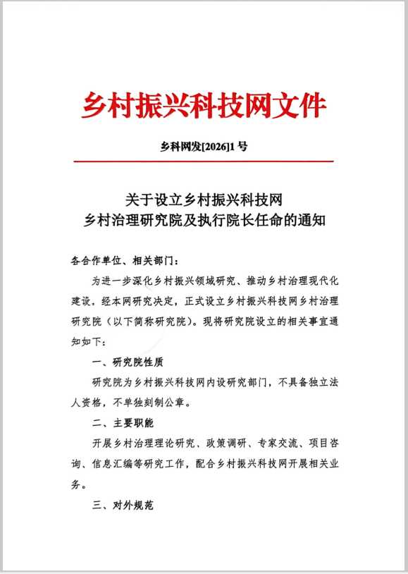 为进一步深化乡村振兴领域研究、推动乡村治理现代化建设,经本网研究决定,正式设立乡村振兴科技网乡村治理研究院(以下简称研究院)。研究院设立相关事宜通知文件如下: