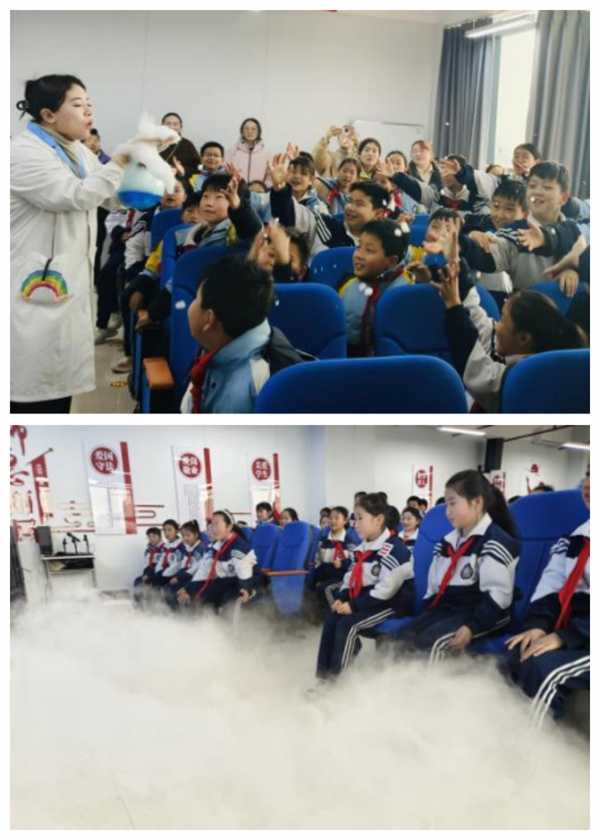 活动中,冰冰老师带领同学们开启了奇妙的“冰与火”科学之旅。在“奇妙的干冰”实验环节,多名同学主动参与互动,亲身体验干冰制造出的“漫天暴风雪”。随后冰冰老师将开水倒入盛有干冰的容器中,大量白雾喷涌而出,同学们借此近距离感受干冰的低温特性,在趣味互动中认识干冰的物理变化。
