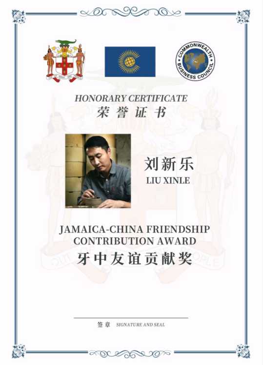活动期间,来自河南省禹州市神垕镇乾名钧窑艺术总监、河南省工艺美术大师、河南省陶瓷艺术大师刘新乐荣获牙中友谊贡献奖,以表彰其在推动牙买加与中国文化交流中的突出贡献。