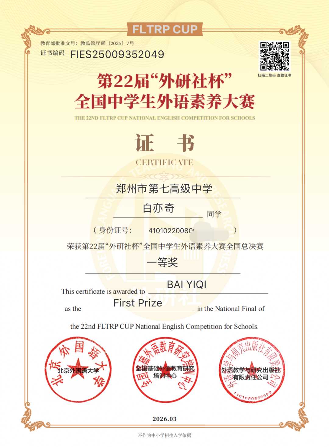 近日,第22届“外研社杯”全国中学生外语素养大赛在江苏无锡圆满落下帷幕。这项代表国内中学生外语能力最高水平的赛事,汇聚了来自全国各地的顶尖选手,竞争激烈,精彩纷呈。我校学子不负众望,3位同学成功闯入国赛,并全部斩获国家级奖项——高二18班白亦奇同学荣获全国总决赛一等奖,高二1班张宁豫、高一李瞳欣同学荣获全国二等奖。此外,86名七中学子在本届赛事中荣获省级奖项,其中46人摘得省级一等奖,充分展现了七中外语特色教育的雄厚实力。 国赛舞台,七中闪光 白亦奇同学从省赛一路过关斩将,最终站上国赛领奖台,获得全国一等奖。这份沉甸甸的荣誉,不仅是他个人语言素养与思辨能力的体现,更是我校“博雅教育”理念结出的硕果。 白亦奇获奖证书 白亦奇在决赛现场 获奖感言|白亦奇:幸运与成长,而非终点 有幸在第22届“外研社杯”全国中学生外语素养大赛中斩获国家一等奖,这份荣誉于我而言,更多是一份幸运与成长,而非终点。作为七中学子,我深知这份成绩的取得,离不开学校深耕的博雅教育,离不开老师的悉心浇灌。七中倡导的博雅教育,注重培养我们的语言应用与国际视野,图书馆的浸润、课堂上的思辨,让我在备赛中不仅夯实了语言基础,更学会用多元视角表达观点,这正是我能在大赛中从容应对的底气所在。备赛路上,老师们放弃休息时间,逐字逐句打磨我的演讲稿,耐心指导我应对即兴问答,他们的辛勤付出,是我前行最坚实的支撑。我深知自己仍有不足,与全国最顶尖选手相比还有差距。此次获奖只是一次激励,未来我会继续带着七中博雅教育的滋养,不负老师的期许,踏实努力、谦逊前行,在语言学习的道路上不断沉淀,努力成为兼具家国情怀与国际视野的七中学子,不辜负学校的培养与信任。 外语特色教育结硕果 除了国赛的耀眼成绩,我校共有86名学子在本届“外研社杯”省级赛事中斩获各类奖项,其中46人荣获省级一等奖(获奖名单如下)。这一数字,是对我校外语教学水平和学生综合素养最有力的证明。优异成绩的背后,离不开英语组全体老师的辛勤付出。从比赛初期的精心组织、细致解读赛制,到一对一的耐心指导;从复赛、决赛的演讲打磨,到总决赛阶段帮助学生搜集资料、开阔思路——老师们事无巨细、倾囊相授。正是这种认真、细致、负责的专业精神,加上同学们的不懈努力,才换来了今天沉甸甸的收获。 博雅教育,让每一个孩子都能发光 此次获奖,不仅是同学们勤学善思、勇于挑战的最好见证,更是我校深耕外语教育、落实“博雅教育”理念的丰硕成果。一直以来,郑州市第七高级中学高度重视学生核心素养的培养,依托省一级外语学科基地的办学优势,整合优质教学资源,搭建多元化成长平台,鼓励学生在各类高水平赛事中锤炼本领、拓展国际视野。我们坚信,语言不仅是工具,更是通向世界的桥梁;教育不仅是传授知识,更是点燃梦想。未来,七中英语组将继续秉持“博雅教育”的初心,以此次大赛的丰硕成果为新起点,助力每一位学子在语言学习与素养提升的道路上笃行不怠,奔赴山海! |