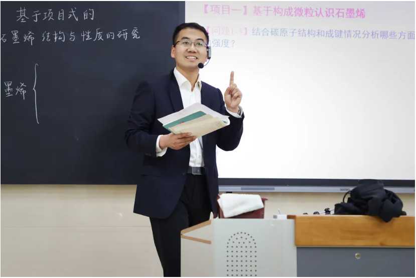 郑州市第四高级中学肖攀登老师以未来革命性材料石墨烯为切入点,由结构推导性质、由性质延伸用途,全面梳理相关知识,介绍其高新应用,课堂蕴含人生哲理。