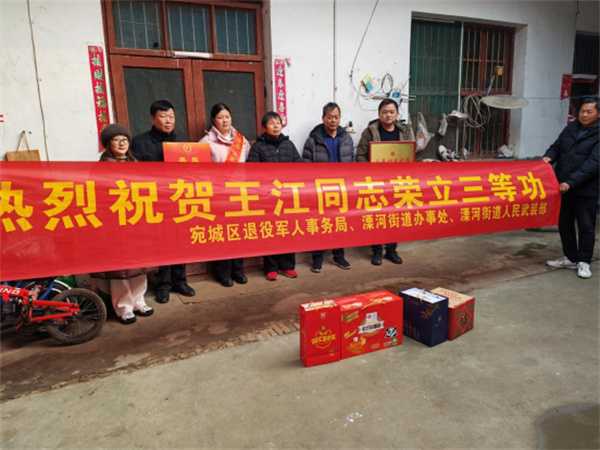 1月27日上午,宛城区退役军人事务局双拥办主任曾庆岑一行专程前往溧河街道邢庄村现役军人王江家中开展走访慰问,为其家属送上王江在部队荣立三等功的喜报和诚挚的节日问候。